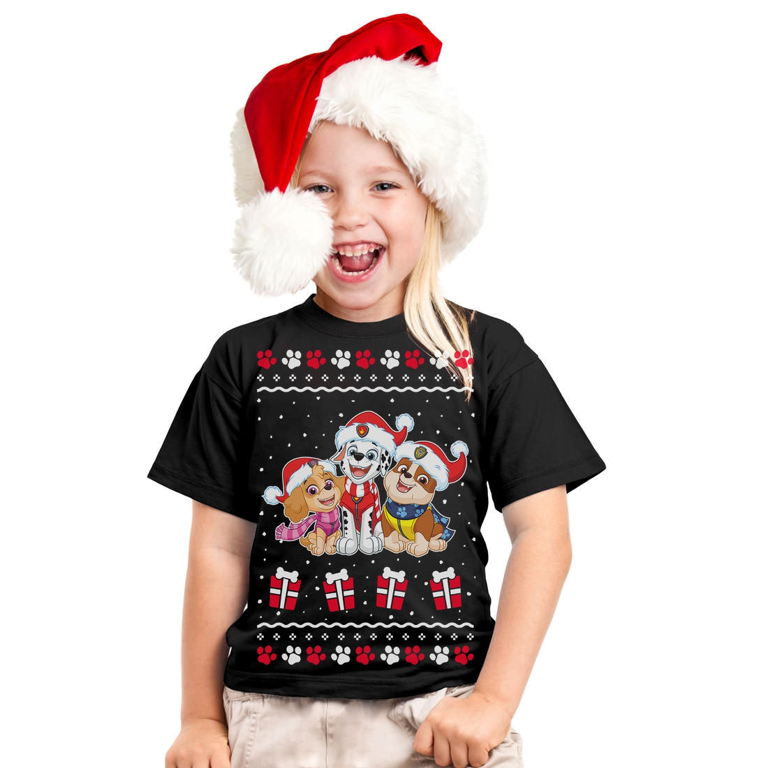 Paw Patrol Marshall, Rubble und Skye mit Weihnachtsmützen im Ugly Christmas Sweater look. Tolles Weihnachten Geschenk für Kinder die Helfer auf 4 Pfoten mögen.