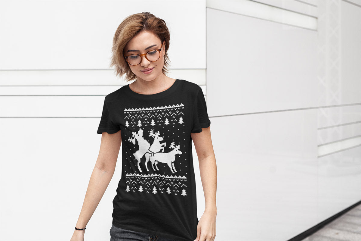Wenn es was unanständiges sein darf. Witziges Weihnachten Motiv mit einem Rentier Dreier im Ugly Christmas Sweater Design.